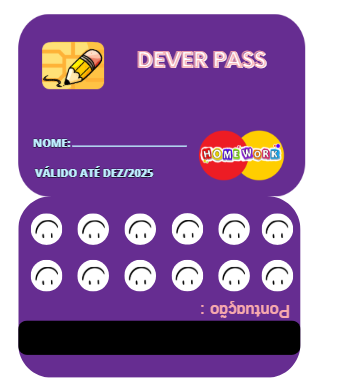 Chegou o DEVER PASS, o recurso lúdico e funcional que vai revolucionar a forma como seus alunos encaram a entrega de lições de casa! Inspirado no clássico modelo de cartão de fidelidade, este arquivo em PDF prontinho para imprimir é a ferramenta perfeita para incentivar a pontualidade, a responsabilidade e o senso de compromisso com leveza e diversão!