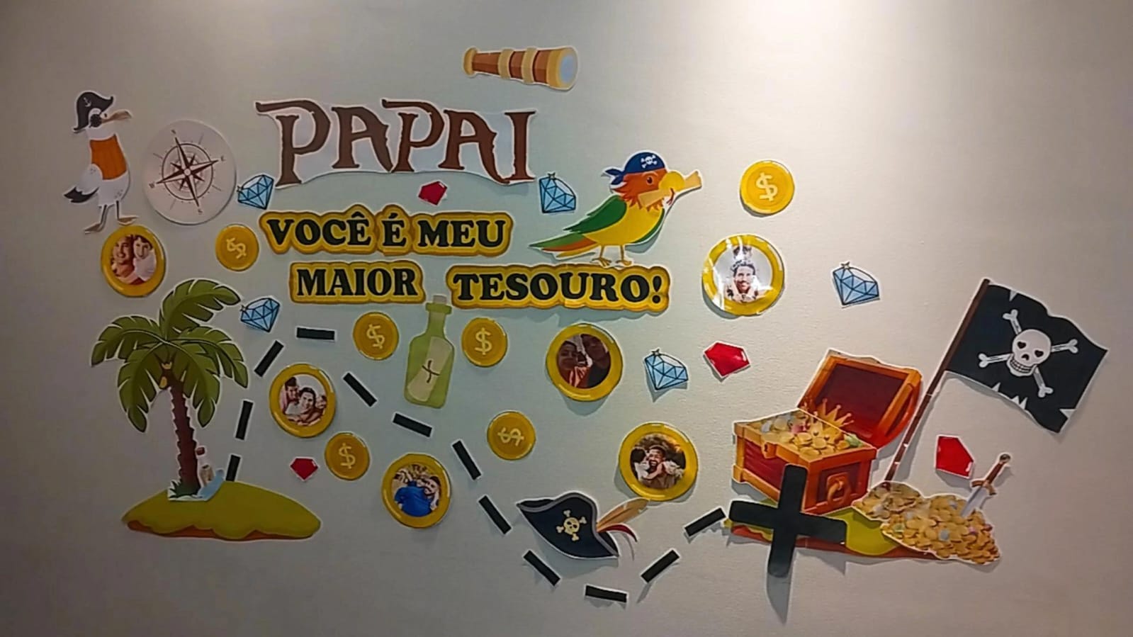 Painel decorativo com o tema “Caça ao Tesouro”, ideal para murais escolares ou ambientes especiais;