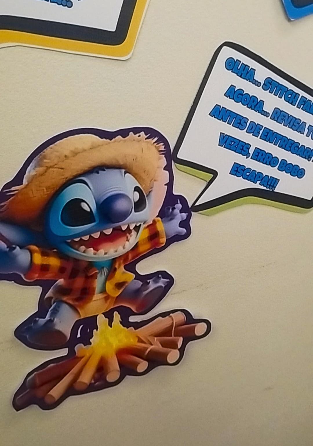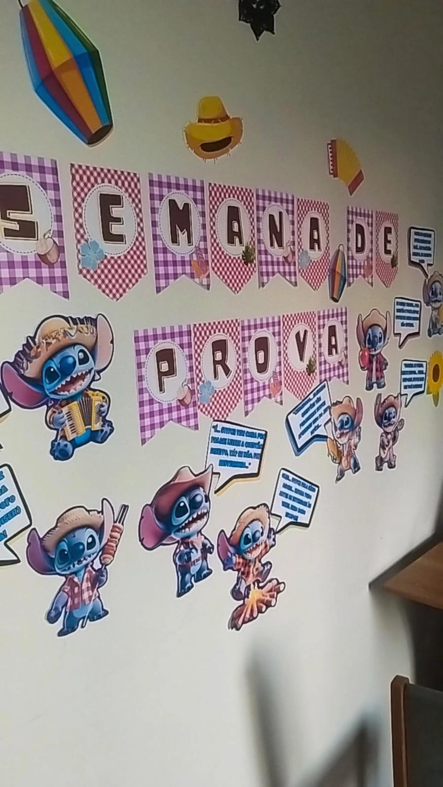 🌟 Painel ‘Ohana na Prova’ versão Junina: Stitch caipira, fofíssimo, dando dicas importantes e frases motivacionais pra os alunos arrasarem nas provas! Tudo com balões de fala, cores vibrantes e aquele jeitinho divertido que eles amam.